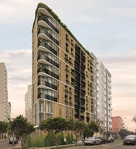 Edificio de 4 sótanos, 10 pisos, azotea con piscina, construcción de 127 departamentos de 1, 2 y 3 habitaciones.